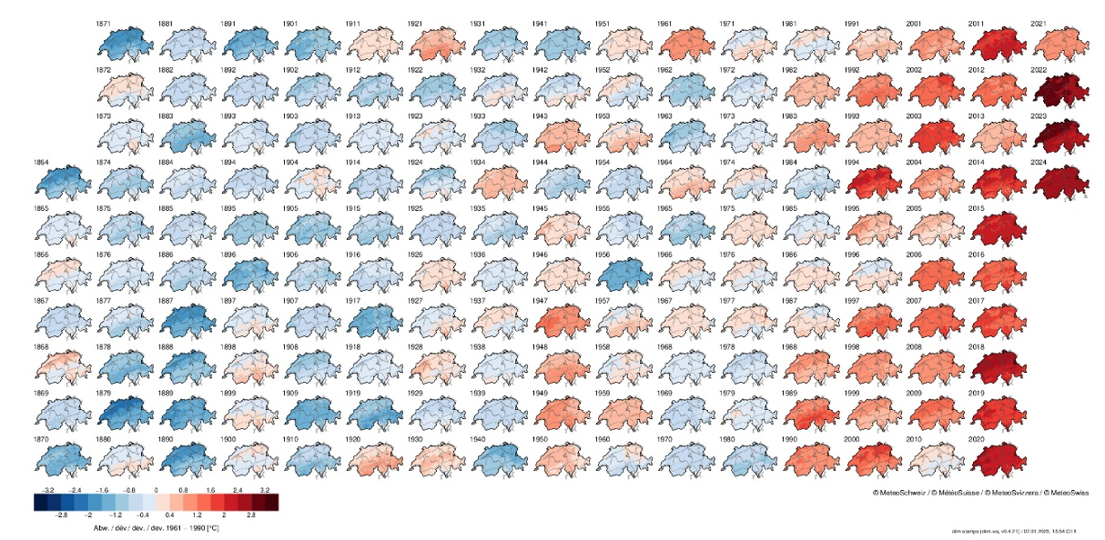 Abbildung 1: Temperaturabweichungen im Mittel 1960 – 1991 in der Schweiz für jedes Jahr seit 1864 (©Meteo Schweiz)