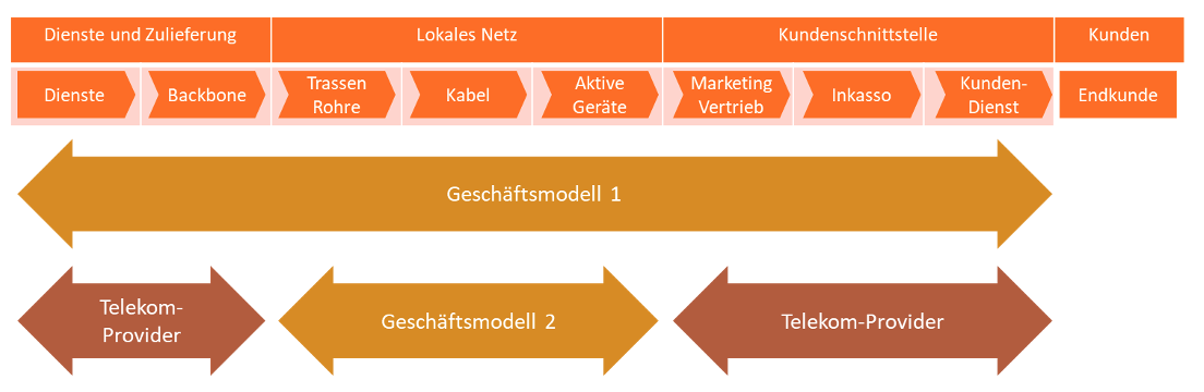 - Geschäftsmodell 1: Das Geschäftsmodell deckt sämtliche Wertschöpfungsstufen ab. Das Unternehmen bietet Endkunden selbst Dienste wie Internet- oder TV an und übernimmt alle dazu notwendigen Wertschöpfungsschritte. Dabei werden eigene Dienste entwickelt und bereitgestellt sowie auch der technische Betrieb für das Netz und die Infrastruktur sowie für Marketing, Vertrieb und Kundenbetreuung sichergestellt. Da das Unternehmen die gesamte Wertschöpfungskette verantwortet, steht ihm auch der ganze Umsatz mit den Endkunden zu.