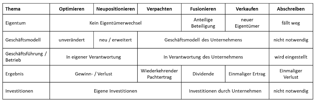 Für jede strategische Handlungsoption sind in der nachfolgenden Abbildung die wichtigsten Auswirkungen aus Sicht des bisherigen Eigentümers zusammengefasst.