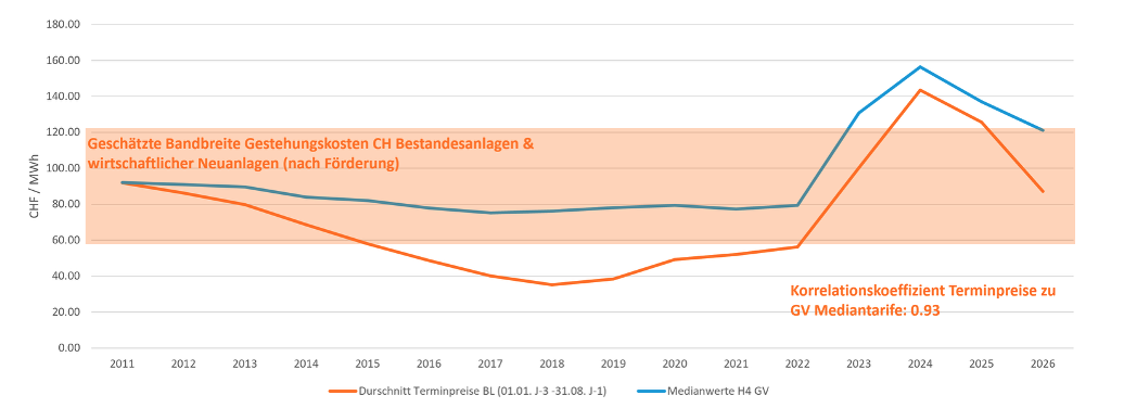 Die nachstehende Auswertung (Abbildung 1) zeigt die hohe statistische Übereinstimmung zwischen den Terminmarktpreisen für Strom (Grosshandelspreise) und den Median-Tarifen der Grundversorgung für Haushaltskunden (Korrelationskoeffizient Terminpreise zu GV Mediantarife 0.93). Damit bildet die kostenbasierte Regulierung die Marktpreisentwicklung faktisch bereits ab, auch wenn sie formal nicht an Marktpreise gekoppelt ist.